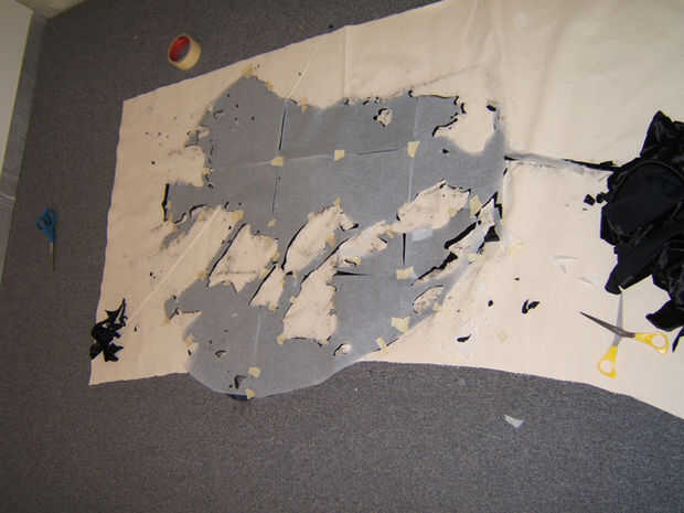 También, ayuda mucho si cinta el corte de la tela y el papel cortado en el suelo mientras se trabaja para mantener la forma de lo que usted está cortando (ver imagen). Esto le dará un recorte más preciso cuando termines.