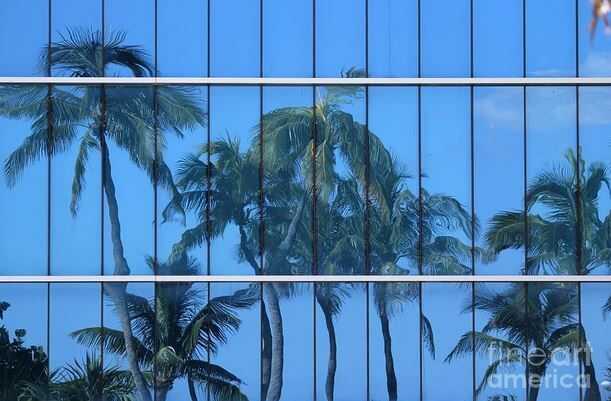 Los espejos pueden ser pequeños o espejos pueden ser muy grandes, como edificios de paredes de cristal. Efectos pueden ser directas, como las palmeras o más abstractos, como las nubes sobre el rascacielos. Usted puede entrar en cerrar y eliminar todos los marcos de referencia, como con las palmeras, captura solamente la imagen reflejada. O puede enmarcar sus imágenes espejadas con algunas pistas de contexto, como muestra el la parte superior de los edificios y algunos sectores de las palmas en la foto de las nubes reflejadas.