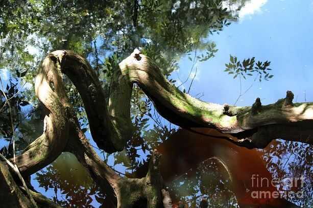 La imagen de la raíz curvada, reflejada en el agua junto con otras reflexiones de hojas y ramas, crea algo de un corazón en forma de imagen en el centro y los grandes puntos de azul desde el cielo reflejado en todo.