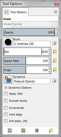 - La ventana de Opciones de la herramienta - en la ventana de la imagen principal, haga clic en Windows -> acoplable diálogos -> Opciones de la herramienta para abrir esto.