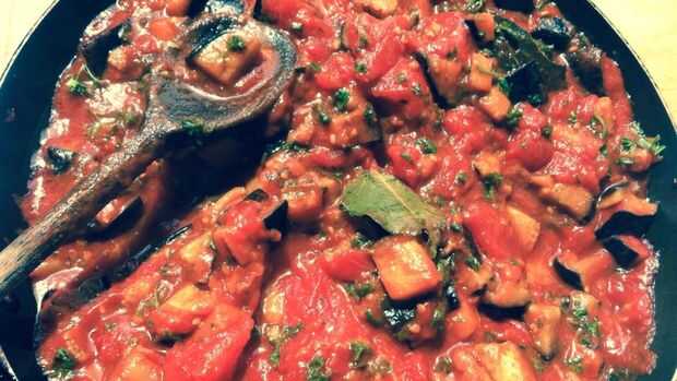 Imam Bayildi traduce al Turco como el 'Imán desmayado' - una de las historias dice que esto es debido a la cantidad de aceite de oliva que ha sido añadido a la receta original! Algunas recetas agregar hasta la mitad de una pinta de aceite, sin embargo he añadido un poco menos a la mía - pero no dudes en añadir más si quieres. Recetas tradicionales a menudo rellenar la berenjena con la mezcla de tomate y cebolla, sin embargo en mi opinión sobre la receta cocinar todos los ingredientes juntos.