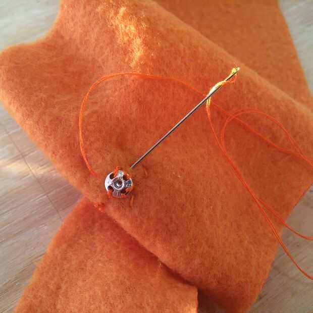 Coloque una mitad de los broches coser con aguja e hilo a la capa superior de la bufanda sobre el imán.