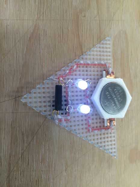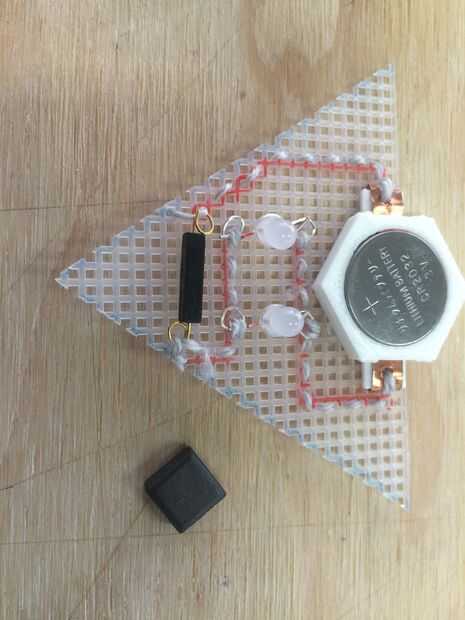 Hay huellas separadas 3 (líneas de color rosa) que son básicamente nuestros alambres en el circuito. Estos deben estar separados unos de otros, se unen solamente por los componentes (LEDs, interruptor, portapilas) en el circuito. Es por eso que fije apagado en el final de la costura un rastro y vuelva a colocar el hilo en el comienzo de una nueva. Si cosió todos juntos en una larga ruta entonces todo sería cortocircuito.