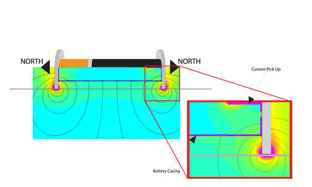 Se arreglan los imanes con los polos mismos hacia fuera. Esto proporciona un buen campo magnético que se encuentra en una dirección uniforme a lo largo de la hoja (bajo la batería). Por lo tanto, la corriente fluye a través de un lugar donde hay un fuerte campo magnético.