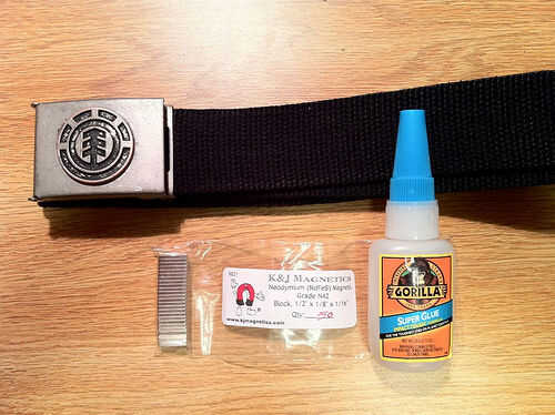 Correa de la tela a., por lo general el tipo vendido por skater orientada a ropa tiendas. B. 4 1/2 "x 1/8" x 1/16" N42 imán barras (comprada mina forma K & J Magnetics) Pegamento del gorila de C. D. algún tipo de escritorio para colgar el cinturón de
