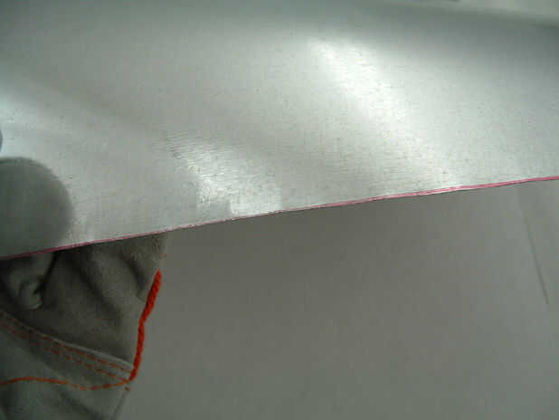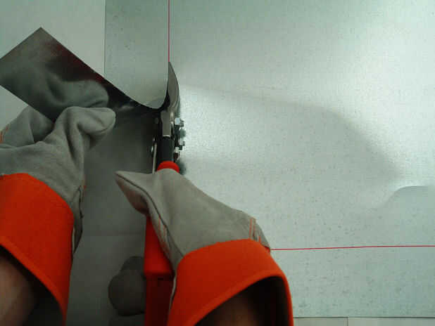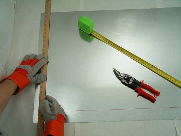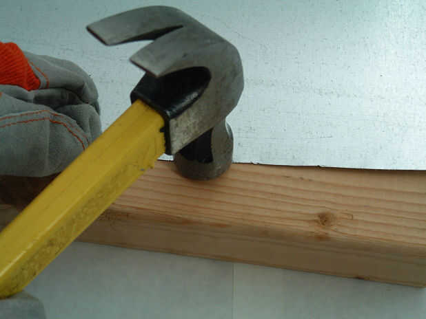 Tijeras para hojalata pueden hacer agudos picos puntiagudos a lo largo de los bordes. Mirar su corte. Si encuentra cualquiera de estos entonces utilice un pedazo de martillo y desechos de madera para aplanar abajo. (Véase el cuadro).