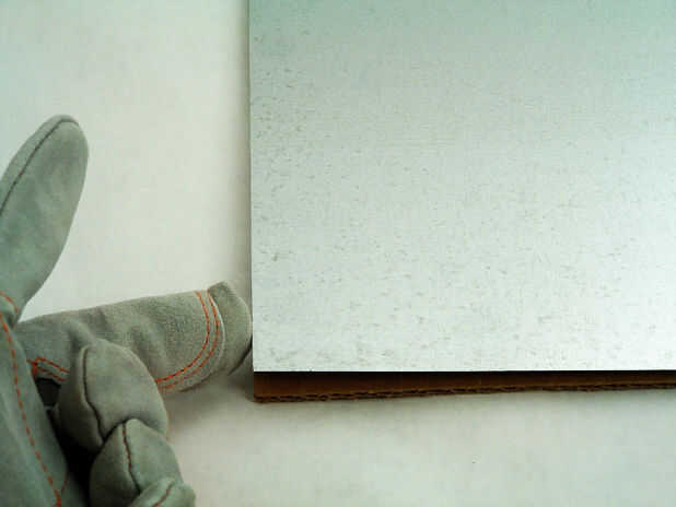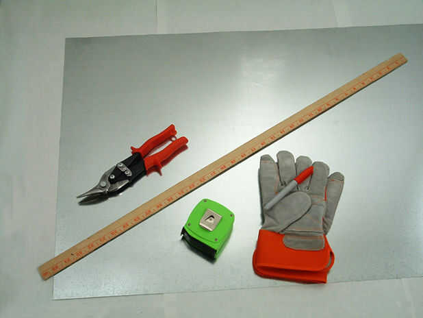 Si tengo que cortar la lata, me gusta para que sea más pequeño que el respaldo de al menos 1" en un lado. Más pequeño está muy bien ya que vamos a colocar y la lata para el apoyo en el siguiente paso de la cinta. Vamos a cortarlo! (Si lleva guantes, derecha?)