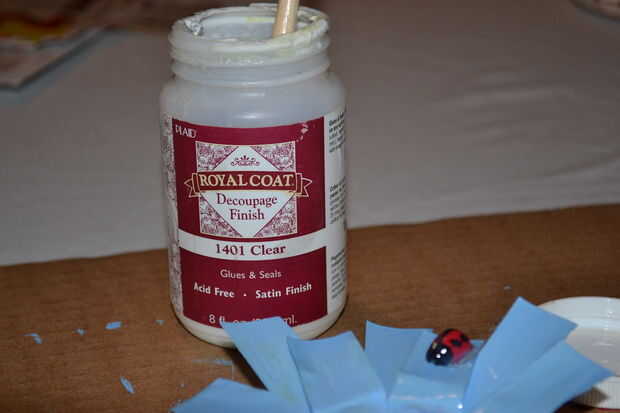 Cubrir su proyecto completo, frente y parte posterior, con pegamento de decoupage. Si no lo hace, su pintura se astillen o el scratch.