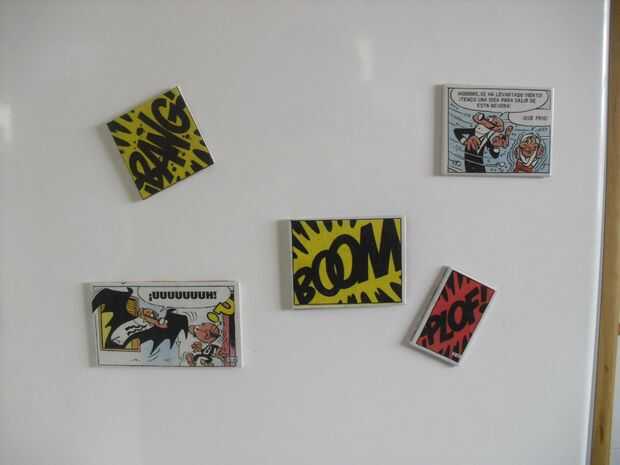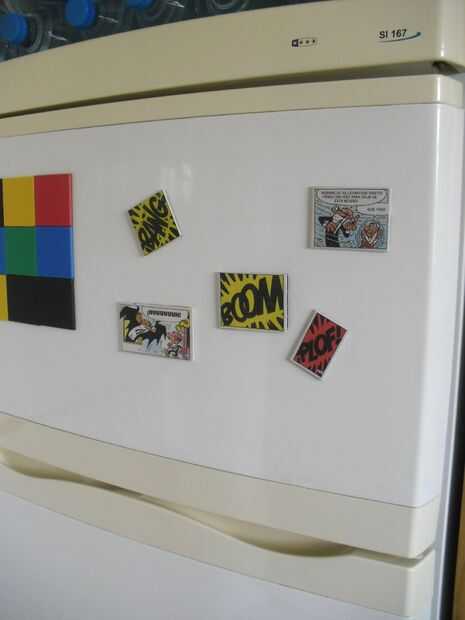 Crear un nuevo look para su nevera o la oficina con las onomatopeyas comics boom, crash, bang y así. Es absolutamente simple, barato y divertido hacerlo. Además, la técnica es válida para las imágenes de revistas, periódicos o lo que sea impresión (papel fino obligatoria). Vamos a empezar!