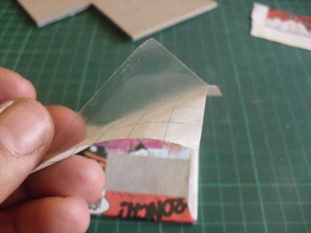 Ahora pegue la cubierta del libro transparente en el centro, cortar otra vez las cuatro esquinas y doblar en la parte posterior de la cartulina. Hacer esto bien, allí es no hay burbujas y la frontera está bien cubierta.