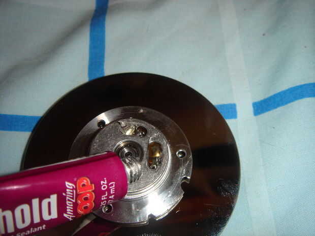 Tomar su pieza de motor de plato montado y el motor pegatina de la parte inferior del motor. La parte inferior debe tener unos agujeros que utilizan para la soldadura de los cables de alimentación. Tome su pegote o Super Glue y llenar estos agujeros. Luego tomar la magnet(s) tú has cosechado y colocarlos sobre los orificios. Los imanes convenientemente mantienen firmemente presionado contra el pegamento.