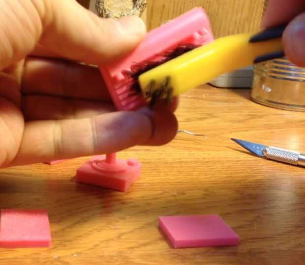 Yo uso un archivo pequeño, cuchillo de la manía y cepillo de cerdas duras, para limpiar las impresiones 3D. Entonces esterilización las impresiones con una imprimación gris.