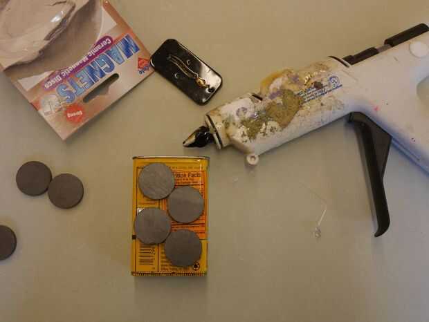 Cuando los dulces o las especies desaparecen, retire la tapa y pegar los imanes en la parte posterior de la lata. Los imanes probablemente se adhieren magnéticamente a la lata, pero utilizo una pistola de pegamento caliente para reforzarlos. De lo contrario cuando pones cosas en la lata puede deslizarse hacia abajo de la puerta del refrigerador. Es por qué me adhiero unos imanes a la can, para hacerla más fuerte, por lo que puede llevar más peso.
