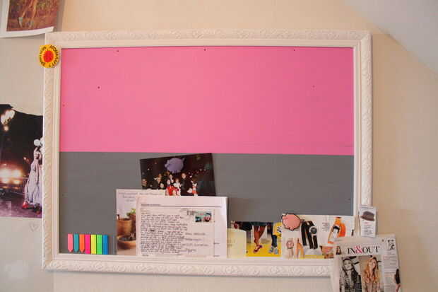 esto es un tablero de tiza magnética lo hice usando un marco de imagen y la parte posterior de la misma como 'tablero'. Con un color de pizarra especial pinté la mitad superior (rosa) y la mitad inferior está pintada con pintura de imán, que ahora es la parte que es magnética. Para mantener notas organizados y quería algo para poner todas mis fotos en :)