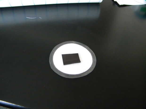 Retire la hoja protectora el pedazo de cinta magnética y lugar lado pegajoso hacia abajo en la parte posterior del papel.