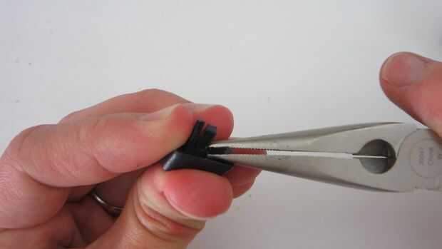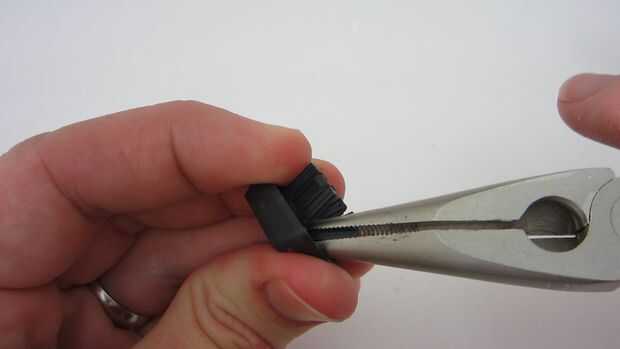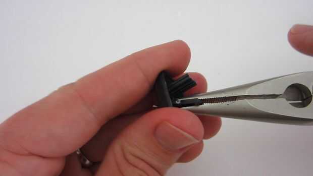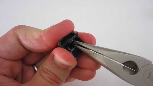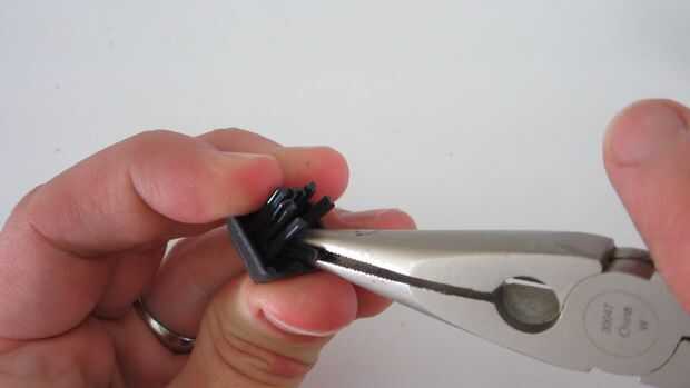 Use los alicates de punta doblar cada una de las pestañas hacia fuera lejos del centro. Luego doblar cada pestaña hacia delante y hacia atrás hasta que se despeguen. Después, si cualquiera de las pestañas se pegan hacia fuera más allá de la parte inferior de la tecla, puede intentar romperlos otra vez o cortar con cortadores de alambre.