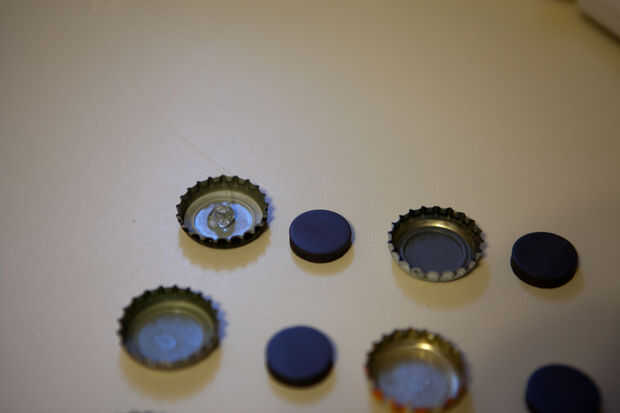 Una burbuja de pegamento se aplican a cada tapa. Hice unos tres o cuatro para que el pegamento fue parcialmente endurecido antes de agregar el imán. Esto le da la altura que debe cumplir el labio de la tapa de la botella. También ayuda a gestionar la posición del imán, ya que se sienten atraídos por las tapas y pueden conseguir desproporcionados si el pegamento no actúa como un amortiguador.