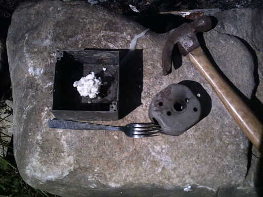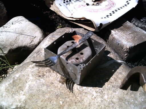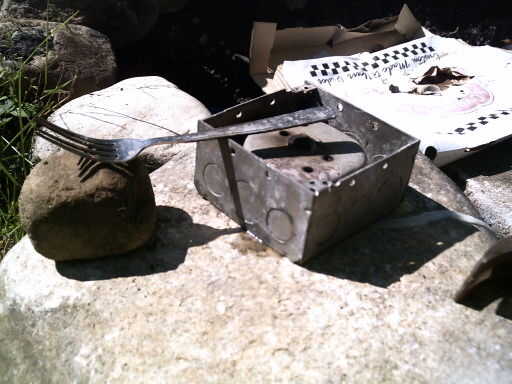 1. Coloque la fuente de combustible en el centro de la caja más grande del metal y luz. Deje que esta quemadura por unos 30 segundos y luego rápidamente la parte superior del horno en la parte superior.