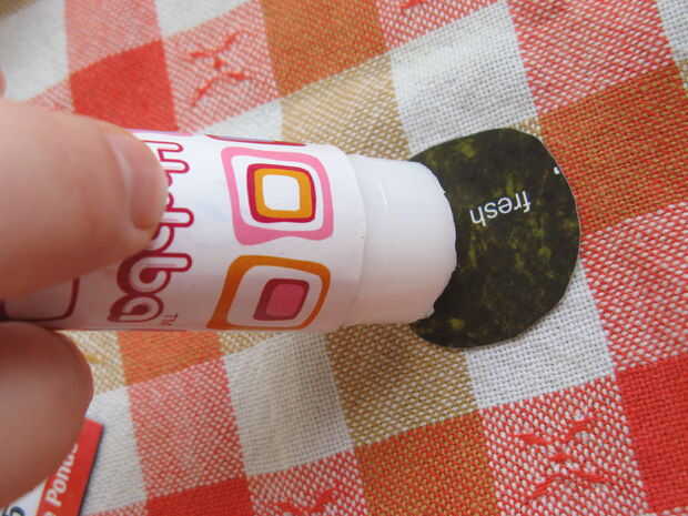 recortar la imagen y aplicar un smidge pequeña de pegamento en la parte posterior de la imagen. sólo necesita suficiente pegamento para ayudar a la imagen de la caída en el imán hasta que la cinta hacia abajo, así que muy escasamente.