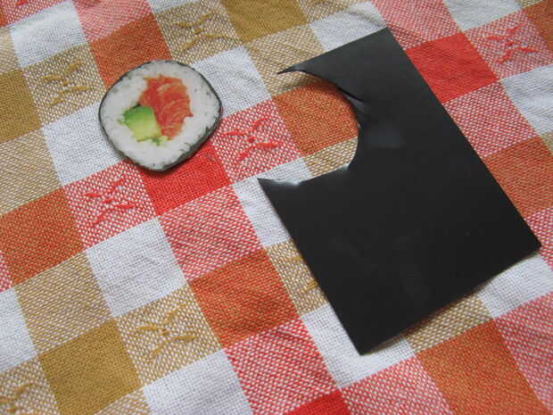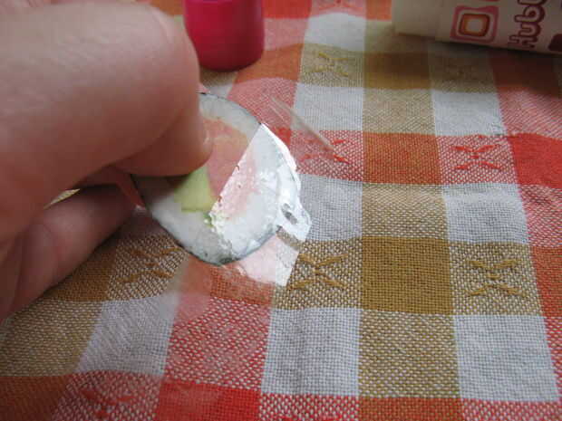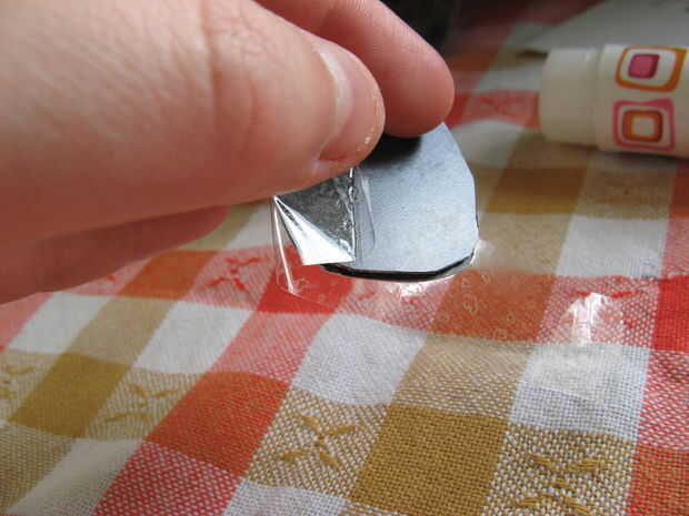 tomar la siguiente pieza de la cinta, se superponen la primera pieza de la cinta por tan poco como sea posible y pegar los bordes hacia abajo detrás del imán. continuar así hasta que la imagen entera y los imanes están cubiertos con cinta y los bordes son agradables y suaves.