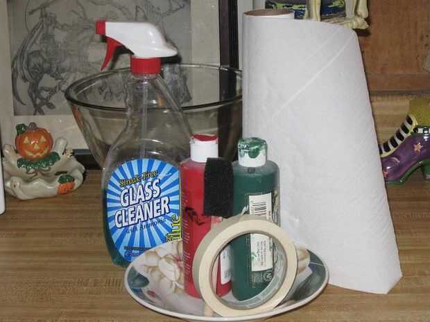 Windex, toallas de papel, pinturas acrílicas de los colores deseados, cinta de enmascarar delgada y un pincel de esponja. También necesitarás un recipiente para poner la pintura en.