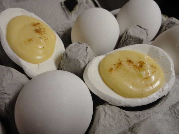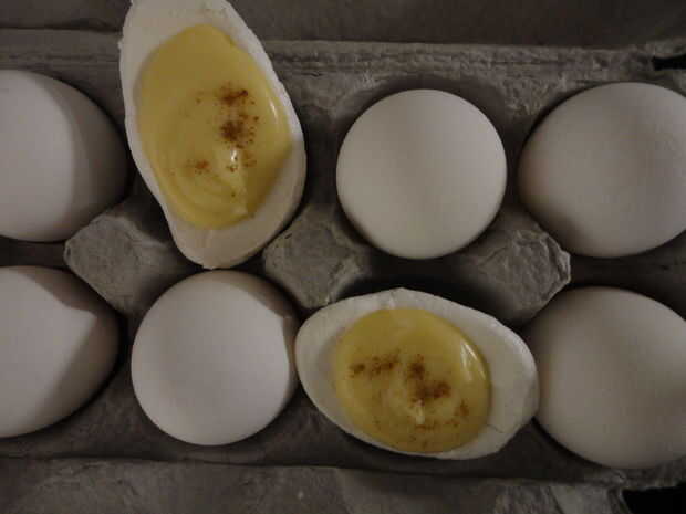 En esta versión del postre de un huevo de deviled, otra vez desmontar y volver a montar el huevo humilde. La clara del huevo es substituido por una cáscara crujiente, esponjoso merengue. El relleno de yema de huevo es imitado por un rico y mantecoso Chantilly crema, el a menudo se encuentran sobre cacao soplos a lo largo de Hawai. Finalmente, se sustituye la vibración acentuación de la guarnición de pimiento con una pizca de canela.