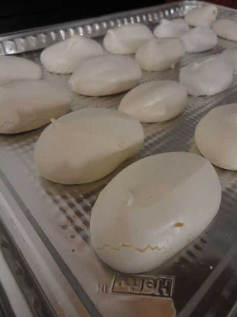 Deslice sus merengues en forma de huevo en el horno y hornear hasta que la parte exterior del merengue crujiente y seca al tacto. En este punto, el interior está todavía pegajoso y tiene la textura de un malvavisco tostado. Si quieres una más crujientes, más galleta como merengue, hornear por una hora adicional.