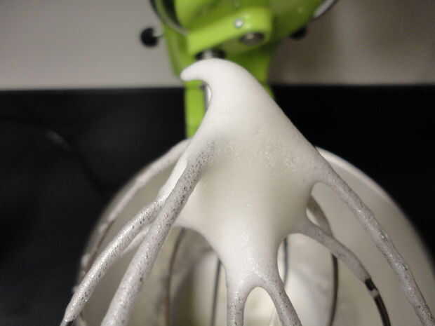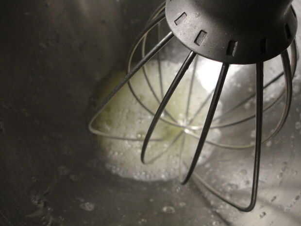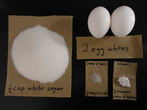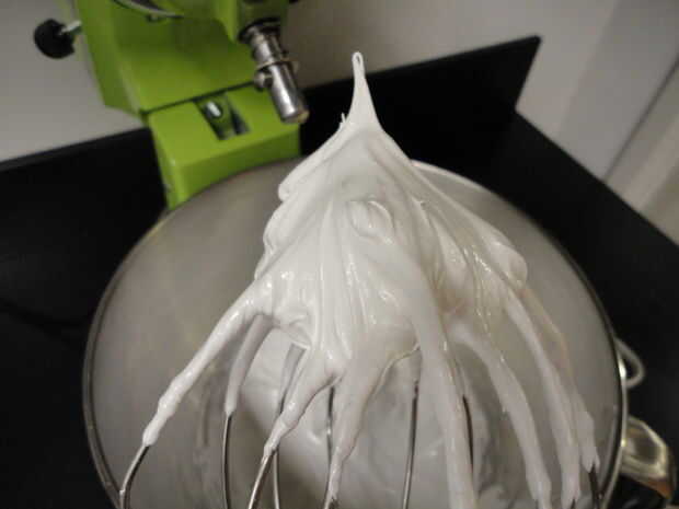En un bol libre de grasa, bata las claras de huevo hasta que una luz se empieza a formar. Yema de huevo, grasas y aceites son los enemigos de esponjosos merengues, ya que evitará que las proteínas forman una red fuerte y robusta. Una vez que estén espumosos, añadir la sal y el cremor tártaro. Aunque no imprescindible, el cremor tártaro ayuda a estabilizar el merengue (la acidez ayuda a desnaturalizar las proteínas del huevo, evitando el merengue de encogimiento y colapso en sí mismo). Batir los huevos blancos, hasta que forma picos suaves (meter la batidora en la mezcla, tire hacia arriba, voltéela boca abajo. Las puntas de pico suave las claras de huevo se inclinación sobre en sí mismo). Seguir batiendo mientras que poco a poco agregar el azúcar (o sólo la pueden descarga todo de una vez. Lo hice). Batir hasta que formen picos (pruebas como antes, pero están tiesos picos hacia arriba. Ninguna caída.) Una vez que usted piensa que tiene picos rígidos, vencer el infierno fuera de él por un minuto. Un merengue muy rígido será más fácil al tubo en forma de huevo. Y no te preocupes por paliza, el azúcar ayudará a estabilizar. En este punto, no dude en añadir el extracto con sabor de su elección. *CAUTION* - extractos a base de aceite hará que su merengue al colapso.