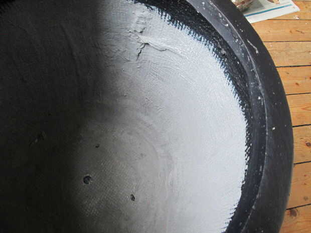 Algunos wallpaint negro al aire libre de mezcla con el acrílico de artistas azul y verde que logré un agradable color azul oscuro emparejar los azulejos en la pared de la fachada. Lo no mezclo muy bien, así que el resultado de la pintura no se ve plano, pero muestra algunas variaciones. Unas cuantas pulgadas en el interior de la llanta como la pintura, puede ser, puede ser visto después de la siembra.
