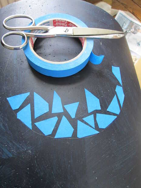 Cortar trozos de cinta adhesiva. He utilizado un azul cinta adhesiva profesional es plana (sin arrugas), pega mejor un es quitada más fácilmente que la versión normal de color marrón clara. Pegue pedazos contra la línea y tratar de llenar los huecos con piezas a juego. Elegir no llene el círculo entero. La brecha hace el patrón más únicas e interesantes. Un patrón repetitivo es como papel tapiz. Un patrón de cambio con variaciones de intriga. ¿Por qué estas formas, ¿asemejan a algo? ¿Es arte?