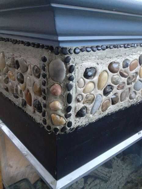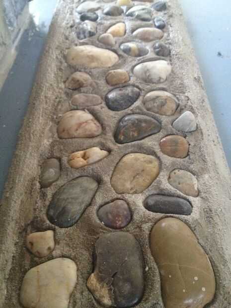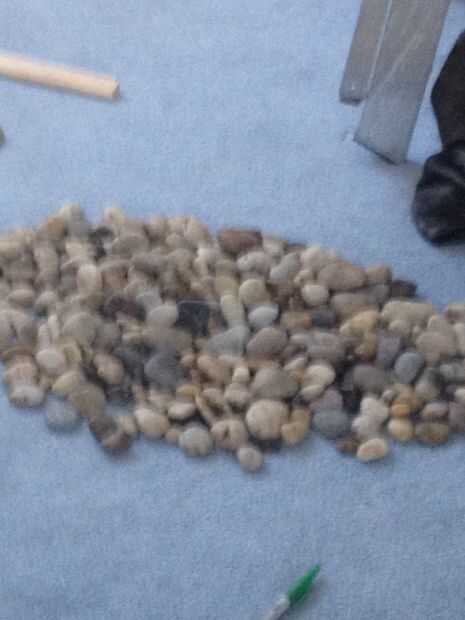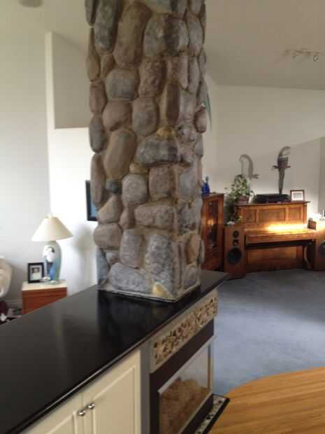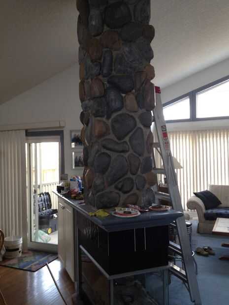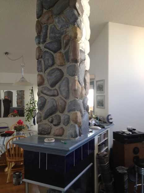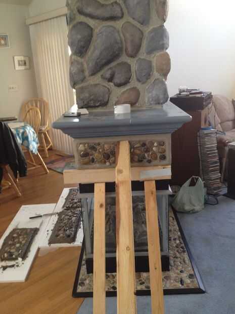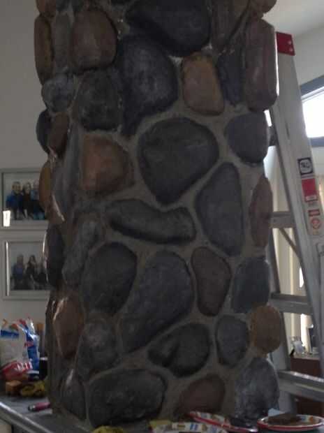 Tomé eso poliestireno blanco, usted puede comprar en prácticos paquetes a Home Depot 2 'x 4', con un cuchillo afilado los corté en trozos ovalados y redondos, y en el lado hacia fuera lo golpeó los bordes para hacerlos más redondos. Pegado a la pared con barro de paneles de yeso, cubierto el entero fuera de pedazos de la roca con fango yeso y pintado para que parezca rock sobre todo marrones y grises junto con blanco, luego usé cemento real como lechada