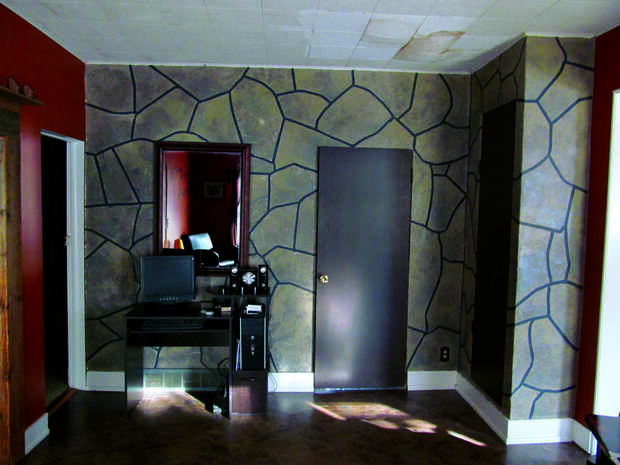 Necesitábamos algo digno de comandar la atención del ojo. Así que para dar a la habitación más interés nos ha convertido en el último proyecto de DIY: creamos un muro imitación piedra. Era rápido (se realiza en una semana en lugar de esperar 4-6 semanas para panel ordenado); y era fácil (resíduo, masking tape y pintura); y sólo cuesta alrededor de $70.