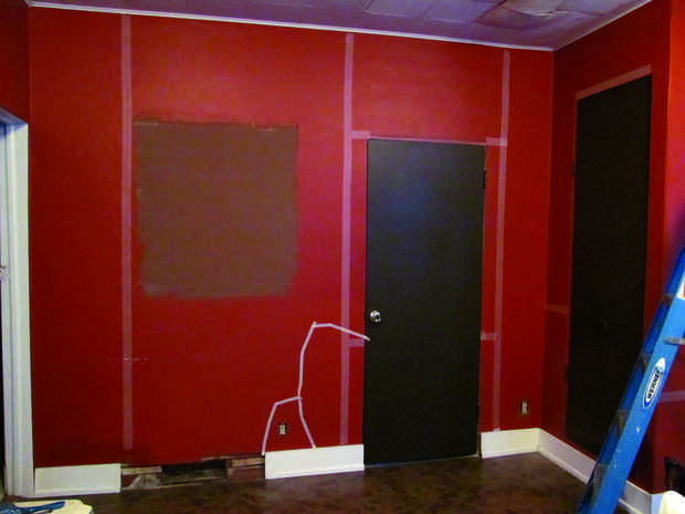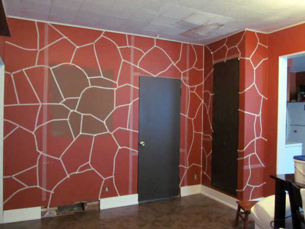 Para comenzar me cinta adhesiva usada para "mapear" la colocación de piedras en la pared. La anchura de la cinta adhesiva es cuán grande será el pozo de "lechada". He utilizado 3/4"- necesitaba alrededor de 1 1/2 rollos para cubrir el 127 pies cuadrados con grandes de la roca.