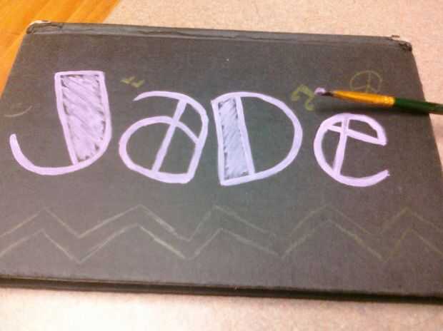 Utilizar la lavanda para mi nombre, me pintó las líneas una vez, luego volvi sobre las líneas para que sea agradable y brillante. Usted puede ir sobre las líneas tantas veces como quieras. Para el diseño que es mi nombre, volví y llena el interior de la "J" y la "D" para que se vea como alguien había coloreado una pizarra.
