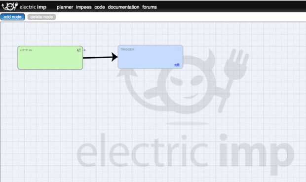 Haga clic en la ficha planificador y usted debería ver un solo nodo azul titulado gatillo. Se trata de su imp que han subido el código de activación. Ahora haga clic en agregar el nodo y elija HTTP IN. Drag una línea de este nodo y conectar al nodo de gatillo. Aparecerá una flecha y luego un cuadro emergente. Haga clic en conectar.