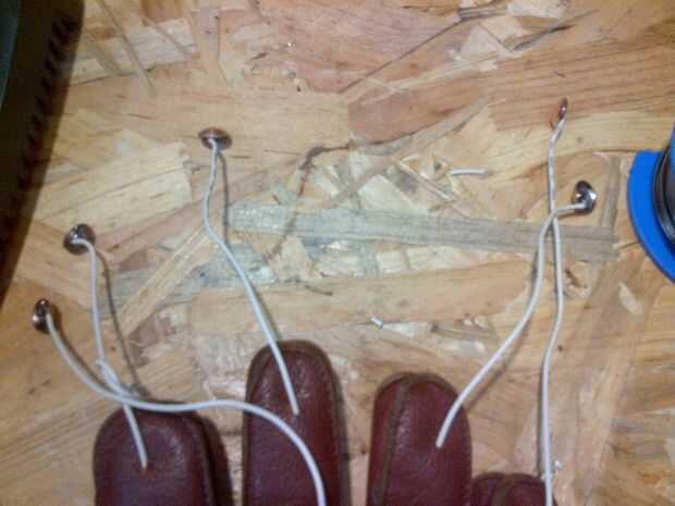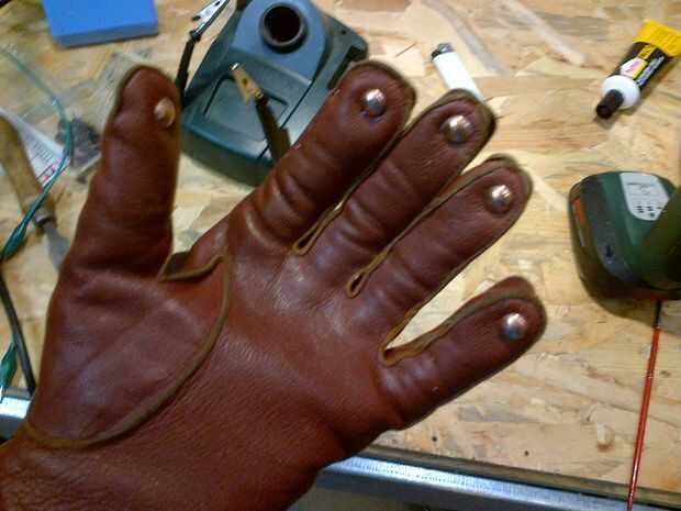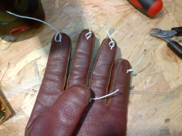 Poco de pasta de soldadura se aplican ahora a los postes de madera (esto realmente hace más fácil soldarlos) y los postes para los cables de soldadura. Luego pegar los postes para el guante con algun pegamento para materiales elásticos.