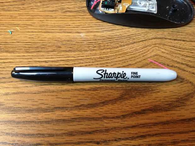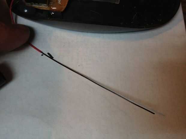 este es el cable que utiliza, excepto una versión gris, que tenía que poner alrededor) y exponer las hebras de alambre en un extremo, tenga cuidado de no cortar el aislamiento de los filamentos individuales porque esto podría causar un arco eléctrico entre los cables. Escoger el color que vas a usar para el cable rojo en mi diagrama. Suficiente aislamiento el cable rojo de la tira para que pueda ir a un agujero y en la otra y luego tiene lo suficiente para inclinarse el cable dentro del ratón por lo que permanece en su lugar. La primera vez que hice este ratón que realmente utiliza un clip para los alambres de contacto, pero ese ratón tenía una costura más grande. Usted también querrá utilizar un marcador permanente negro y pintar el cable negro para disimular el vacío (en comparación con un alambre color cobre brillante) si tienes un ratón negro como el mío.