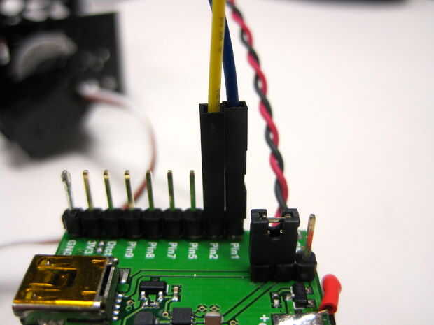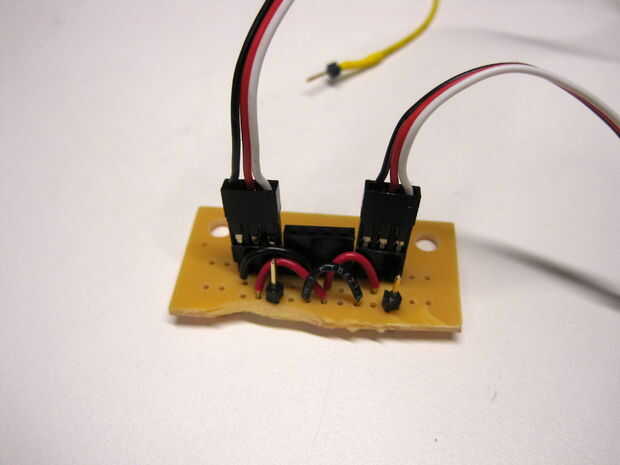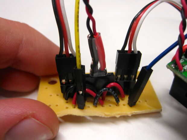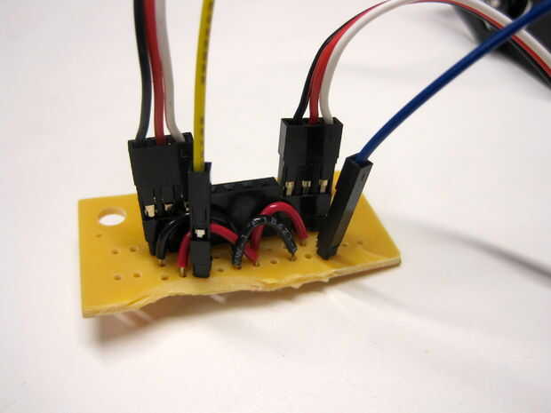 Los servos ya cuentan con cabeceras de zócalo femenino, por lo que podemos evitar para soldar completamente por sólo poner algunos encabezados pines macho en el perfboard. También he añadido que un par de cable conduce a mi breakout Junta para Vin y GND, que conectado a pins macho. Colocar un enchufe hembra de 4 pines en el perfboard (sólo necesitaba dos pasadores, pero fueron el más pequeño tenía cuatro pines zócalos).