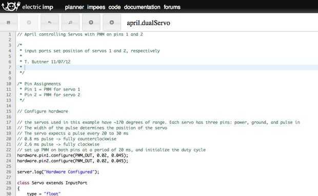 - El imp se empezará a ejecutar el código en pocos segundos. Las palabras "Controlador de SERVO doble abril" aparecerá en el cuadro azul una vez que el imp está configurado.