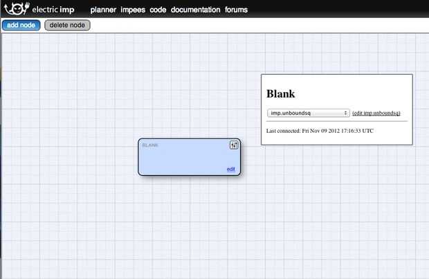 - Parpadear hasta tu impBot hacer tu red wifi. Aparece un cuadro azul en su plan. Si no parpadeó por un imp en su breakout junta antes, el cuadro azul a decir "En blanco", como el imp servicio no tiene ningún firmware para ejecutar en el tablero hasta que asigne uno.