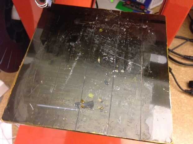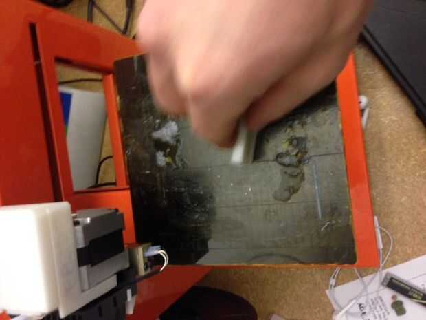 Mientras que están extendiendo la acetona, una pequeña cantidad de la parte de desecho se disuelven. Esto es lo que vamos: para disolver una pequeña cantidad de la parte ABS y que deposita como una capa fina sobre la plataforma de la construcción. Sólo necesitas difundir esto alrededor de la zona donde se construye su parte.