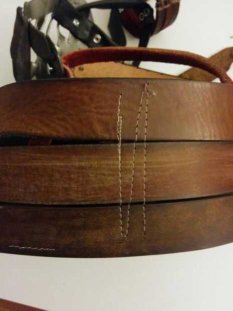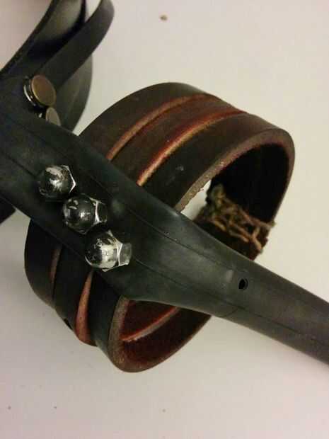La banda del brazo era tres piezas de correa de cuero marrón cosió junto con guita entonces atado a la correa de tubo de bicicleta con las tuercas de orejeta.