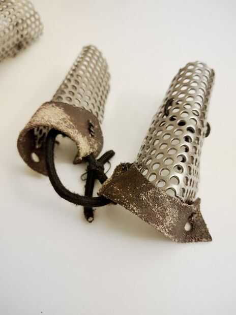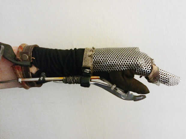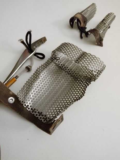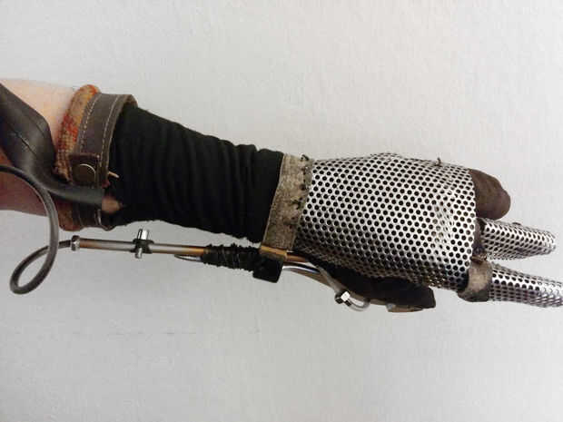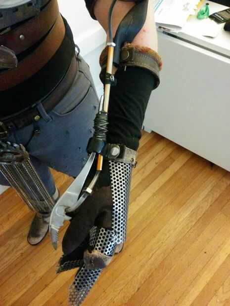 El brazo es donde empecé con un plan, sólo tenía que hacer lo que el heck que pude para conseguir que se parezca... bueno nada. Tengo un pequeño pedazo de metal perforado (cerca de 12 "x 12") de Amazon y usa unas tijeras para metal para obtener la forma correcta para el dorso de mi mano. Había cosido en una correa de cuero alrededor de mi muñeca. Luego hice casi lo mismo para los dedos. Intenté varias veces para conectar todas las piezas juntas, pero terminó con elástico para mantener en mis manos. He añadido un montón de fotos para que veáis cómo jury-rigged esta cosa juntos.