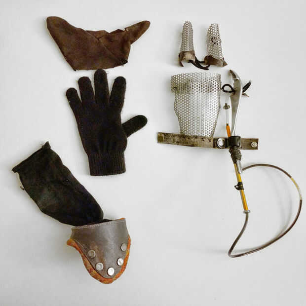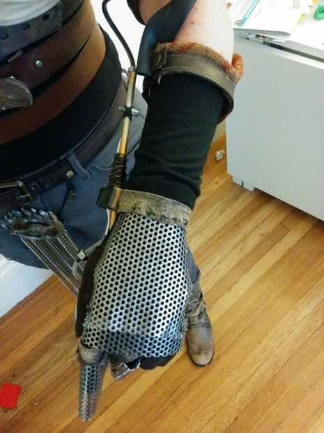 Hice el brazalete de cuero, tela de tapicería y montantes de metal y una manga que se le atribuye. Me puse un guante negro en todo el metal no me muerda y hecho un guante medio poco para repasar mi anillo y pinky dedo y el pulgar. El poco de cuero ayudó con la ilusión.