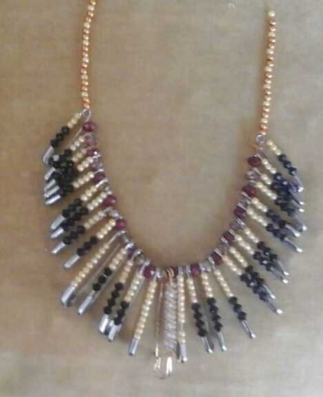 para hacer este collar, usted necesitará:Alguna cadena (un viejo collar comprado en una tienda de caridad es suficiente)Algunas cuentas agradablesUn broche de collar y 2 anillos de saltoPernos de ojoAlicates (tengo 2 juegos, uno con tapas redondas, q