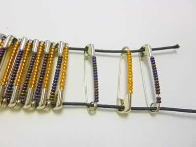 esta pulsera imperdible es fresco, fácil de hacer y se deshace de esa gran caja de imperdibles en tu armario! Todo lo que necesitas es 80 pernos de seguridad, (cuanto más grande mejor)! cuerda elástico y semillas o granos E en colores de su elección.