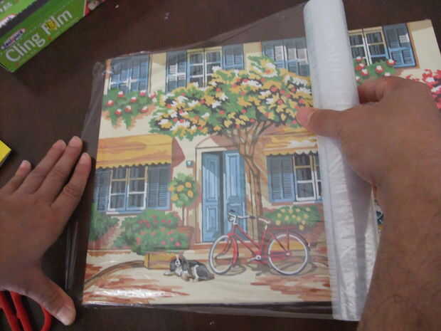• Mantener la imagen y envolver el film transparente en la parte delantera y trasera de la imagen, teniendo cuidado para minimizar las arrugas