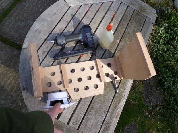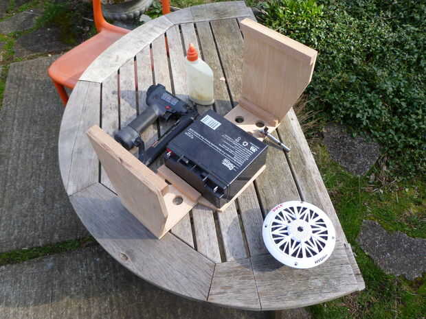 El resto de la estructura I pegado y grapadas. Utilicé tornillos para unir dos piezas de madera que te ayudará a bloquear las pilas. Así, si o si, decido agregar una segunda batería, puedo moverlos a donde serán necesarios en ese caso.