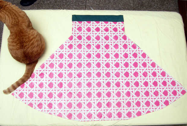 Comenzar colocando el soporte superior sobre el borde superior doblado el recorte de mantel y perno hacia abajo (ver la foto). El soporte superior, que eventualmente se coserá a la correa para el cuello, debe cubrir 1-2 pulgadas a cada lado del listón. Con el fin de reforzar el mantel plástico, debe coser una línea a través de ambos lados del soporte superior todo el camino alrededor de un poco menos de un cuarto de pulgada del borde.