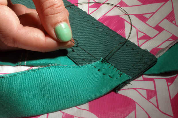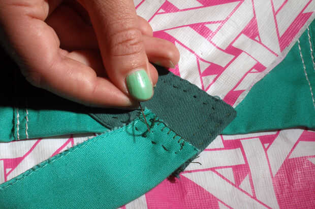 Si usted está preocupado acerca de los bordes de la correa de cuello deshilachado, puede hacer una puntada de ribete. Esta puntada es como las traseras regular sobre la puntada de borde, excepto Enhebre la aguja a través del lazo antes de lo enseñado. Ver las fotos adjuntas para clarificación.